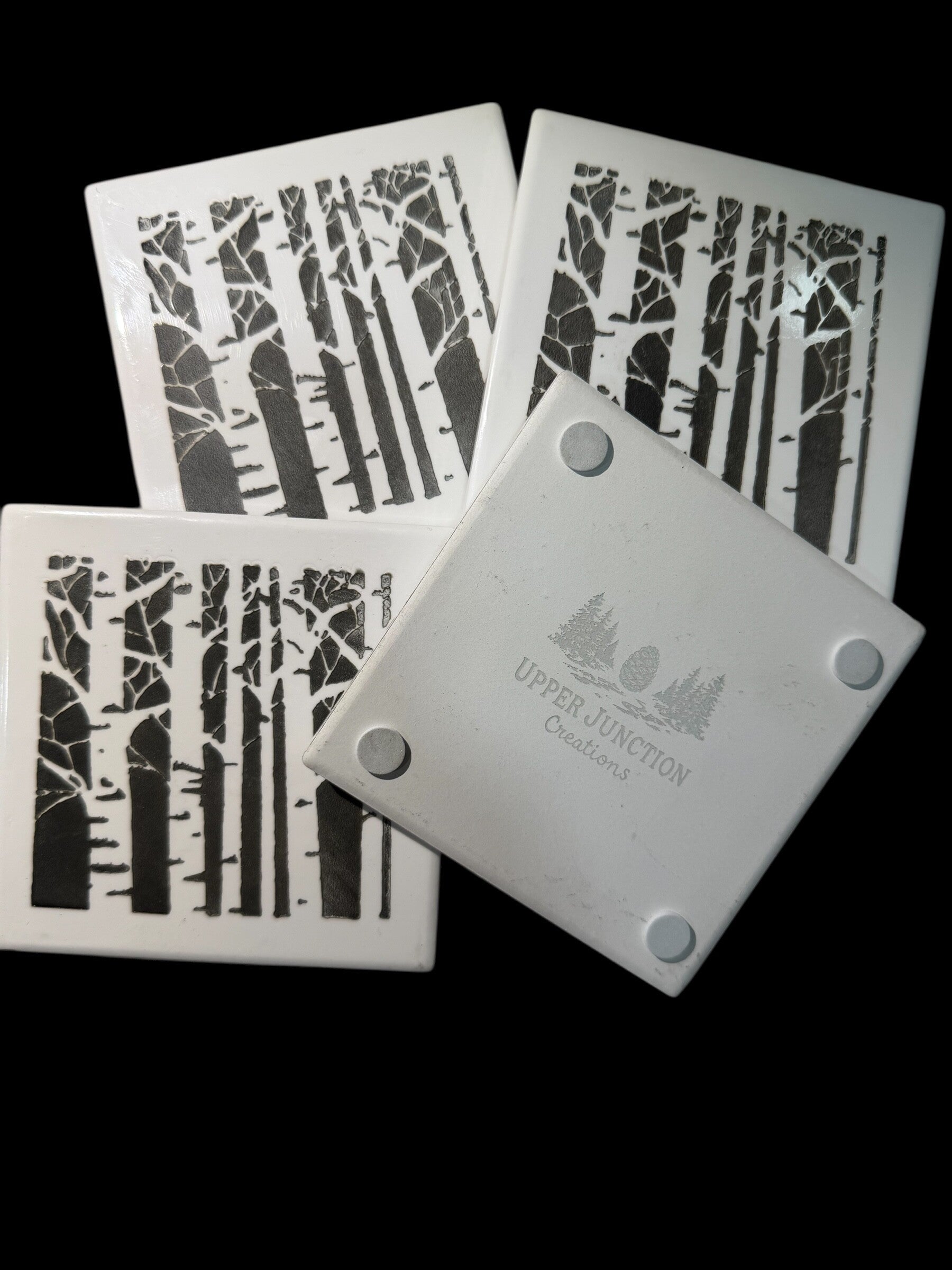 SET OF FOUR PORCELAIN COASTERS WITH BIRCH TREE ENGRAVING.